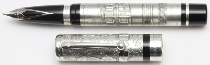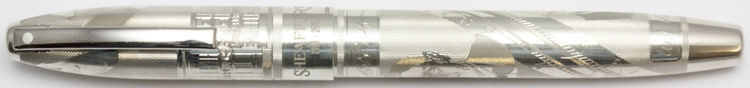 The cap features images and the signatures of W.A.Sheaffer and his Son Craig, and a background of SHEAFFER'S 100 is writen around the cap, while a chain of inlaid nibs decorate the top. The barrel shows images of the former Sheaffer US headquarters on Avenue H, in Fort Madison, that was suituated along the railroad tracks and the great Mississippi river. |
