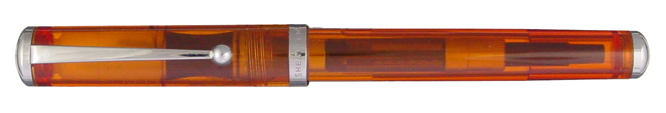 Transparent orange cap and barrel with palladium plated clip and trim.Fitted with a 14kt solid white gold nib, imprinted both Sheaffer and Levenger.