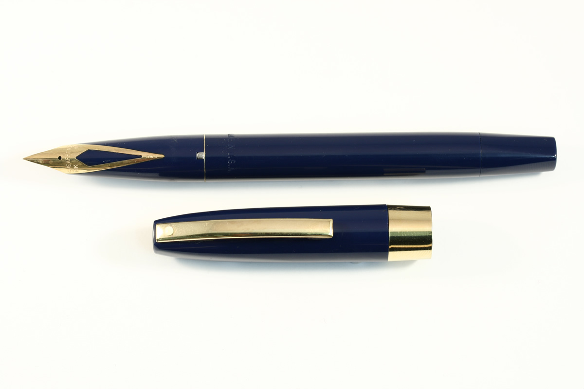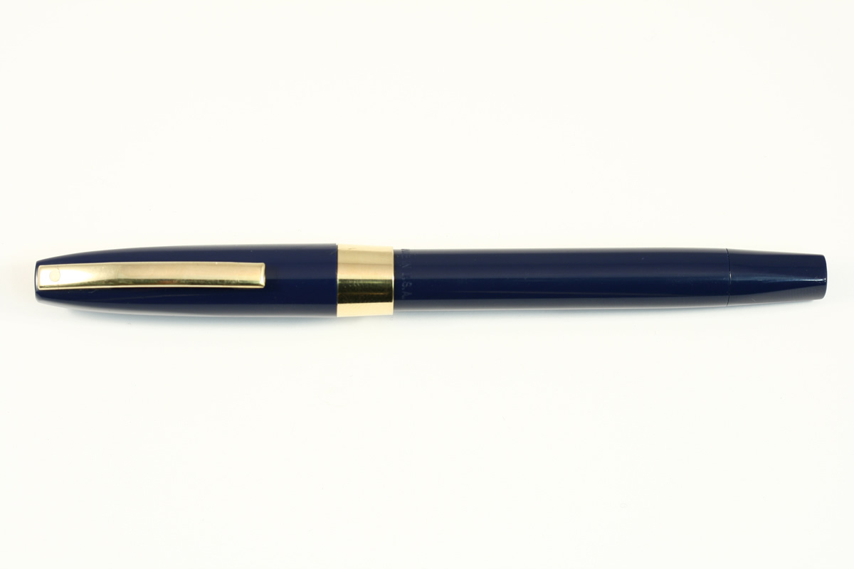 | Blue plastic cap and barrel with the touchdown filling system, the cap has a 3/8" gold filled band and clip. Fitted with a 14K gold inlaid nib. |