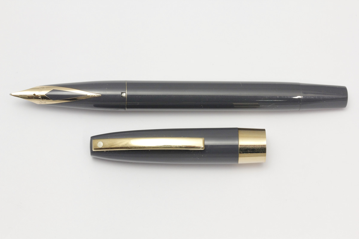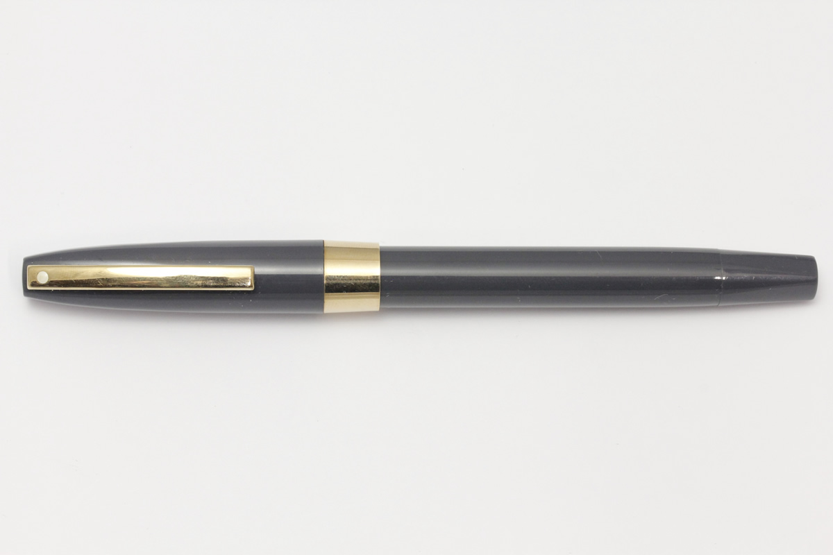 | Grey plastic cap and barrel with the touchdown filling system, the cap has a 3/8" gold filled band and clip. Fitted with a 14K gold inlaid nib. |