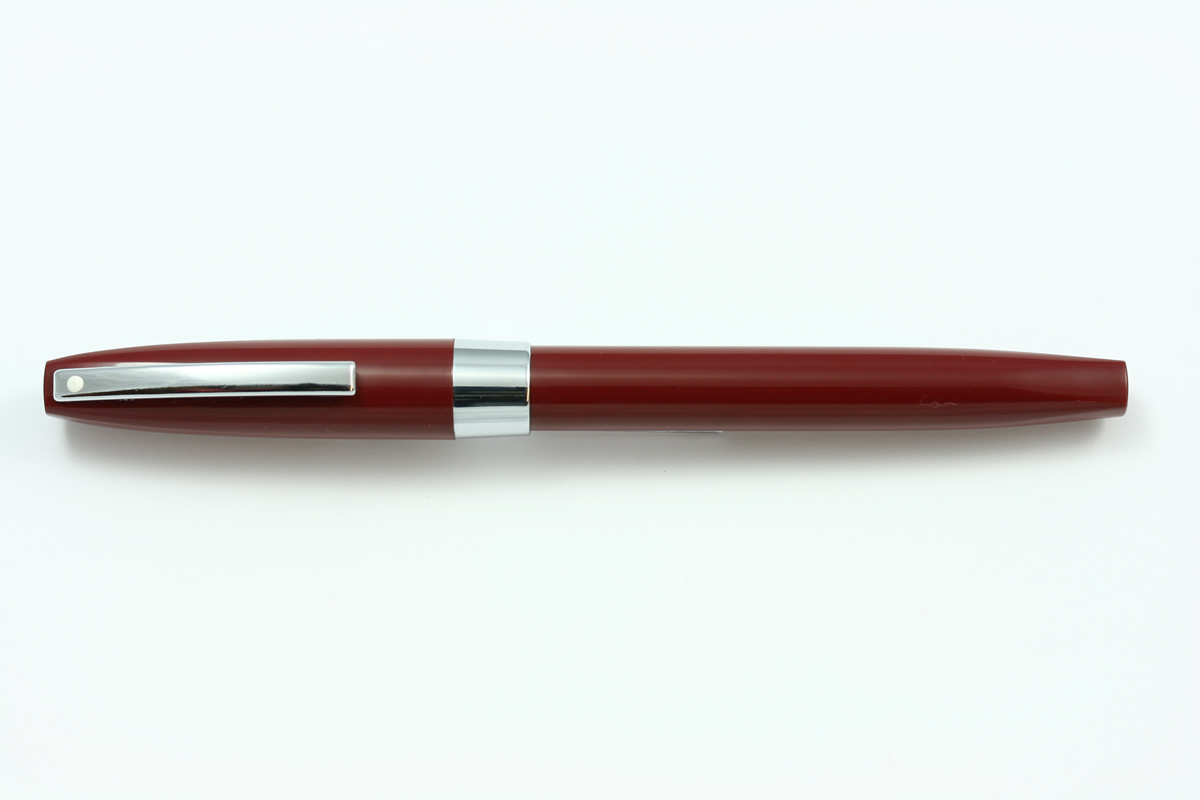Burgundy plastic cap and barrel ,with chrome plated trim .Fitted with a stainless steel inlaid nib.
