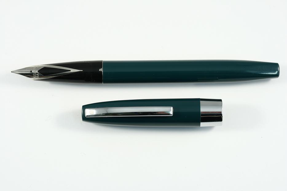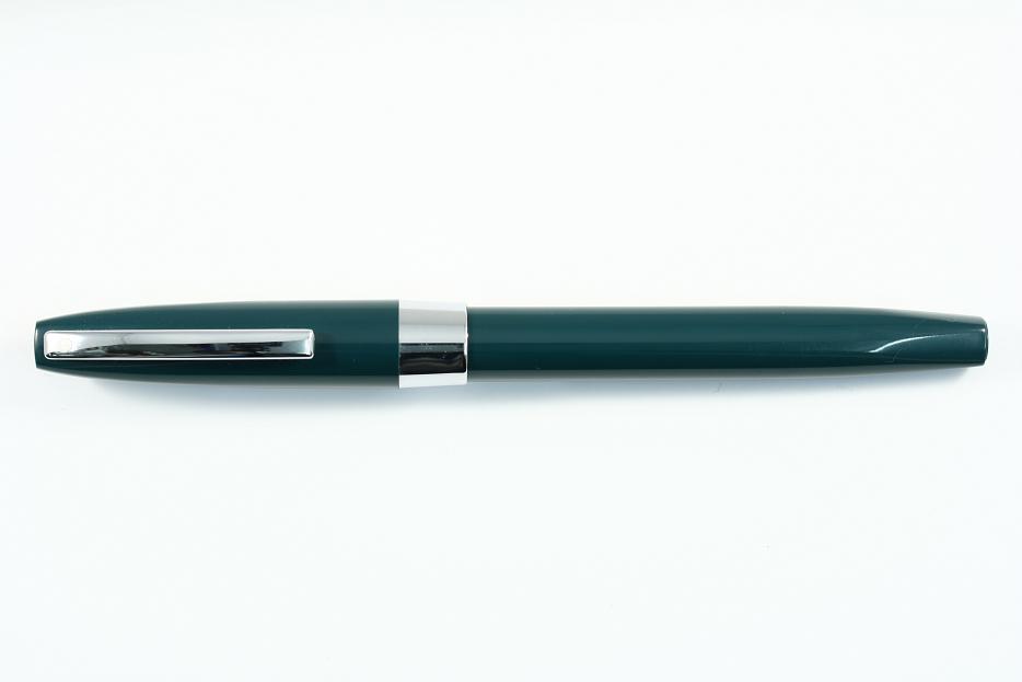 Green plastic cap and barrel ,with chrome plated trim .Fitted with a stainless steel inlaid nib.