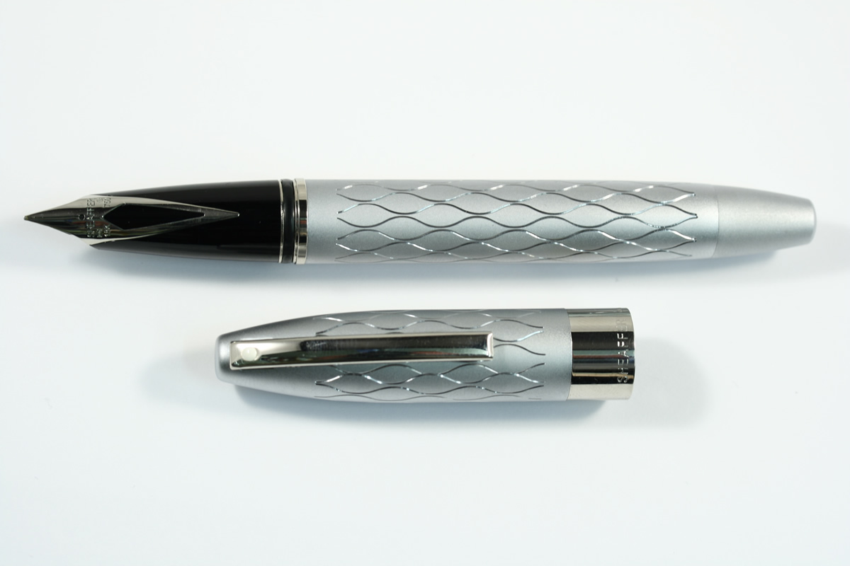 | Satin chrome plated finish cut in a sweeping hour glass pattern with palladium electroplated trim, fitted with a solid 18ct gold nib with palladium electroplate overlay. |