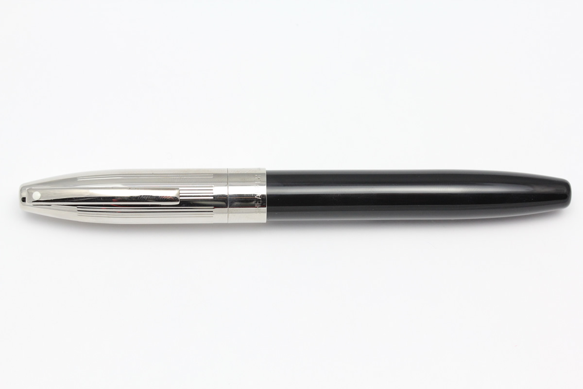 Deep cut straight lined pattern palladium electroplate finish cap and black laque barrel with palladium electroplated trim, fitted with a solid 18ct gold nib with palladium electroplated overlay.
