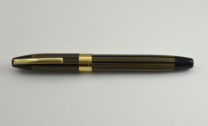 Laque black cap and barrel cut in a straight line pattern with 23ct gold electroplated trim, fitted with a solid 18ct gold nib .