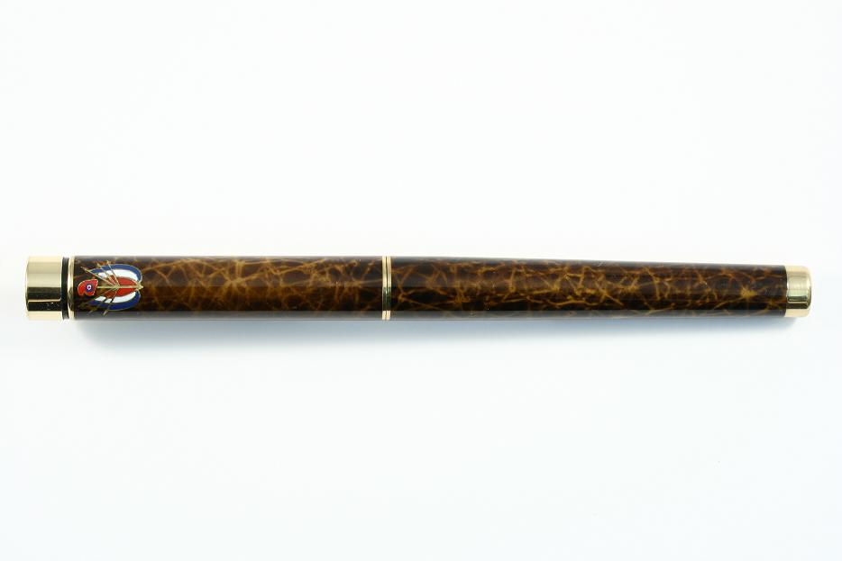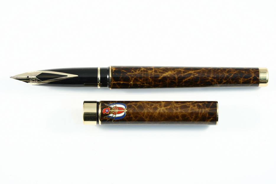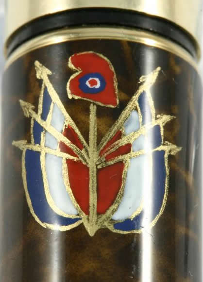 Laque Thuya finish with French Revolution Emblem on cap.Made as a Special Edition of two pens,one was given as a gift to a Sheaffer Executive and the other was saved by Art Nouveau.Completed with a 14-carat solid gold nib.