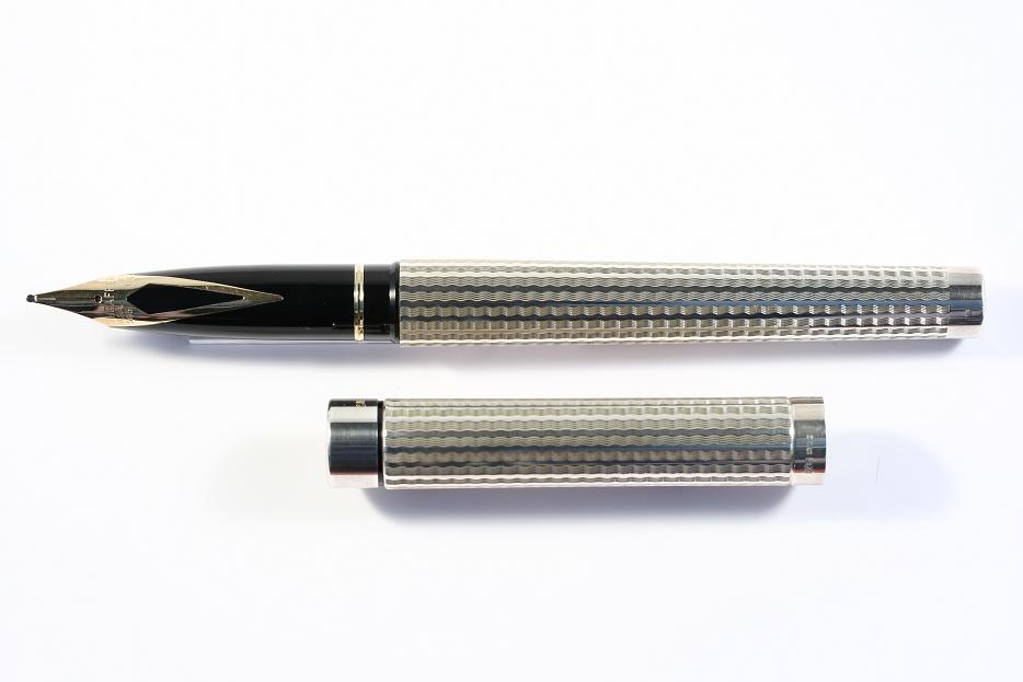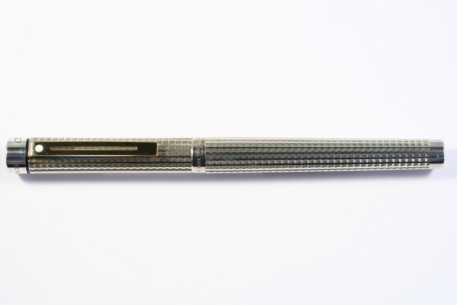 Sterling silver finish in a vannerie pattern with gold plated trim.Fitted with a 18kt carat solid gold nib.
