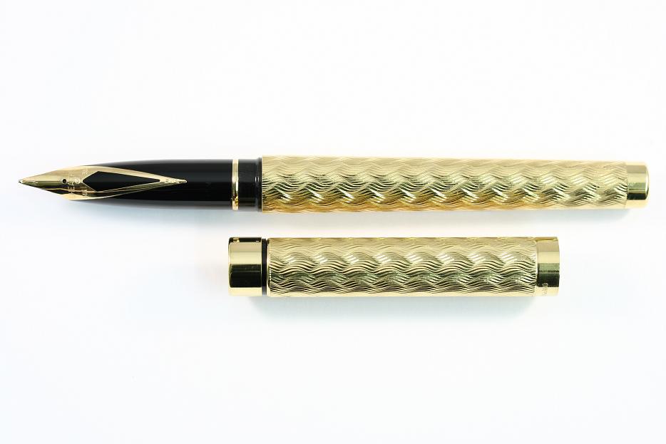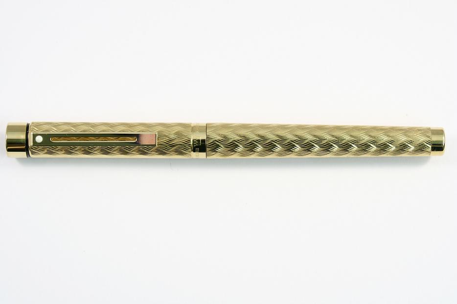 Gold plated finish in a deep cut wavy line pattern with gold plated trim.Fitted with a 14 carat solid gold nib