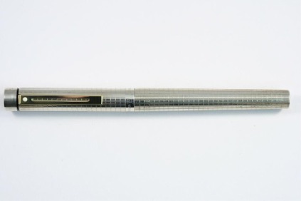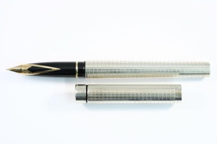 Sterling silver in a chequered pattern with gold plated clip. Fitted with a 14-carat solid gold nib.
