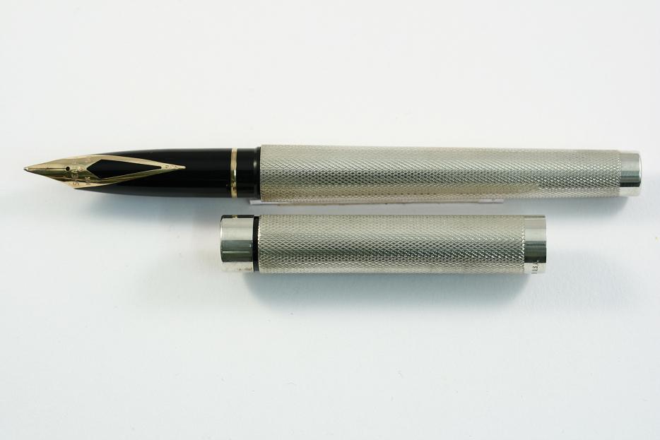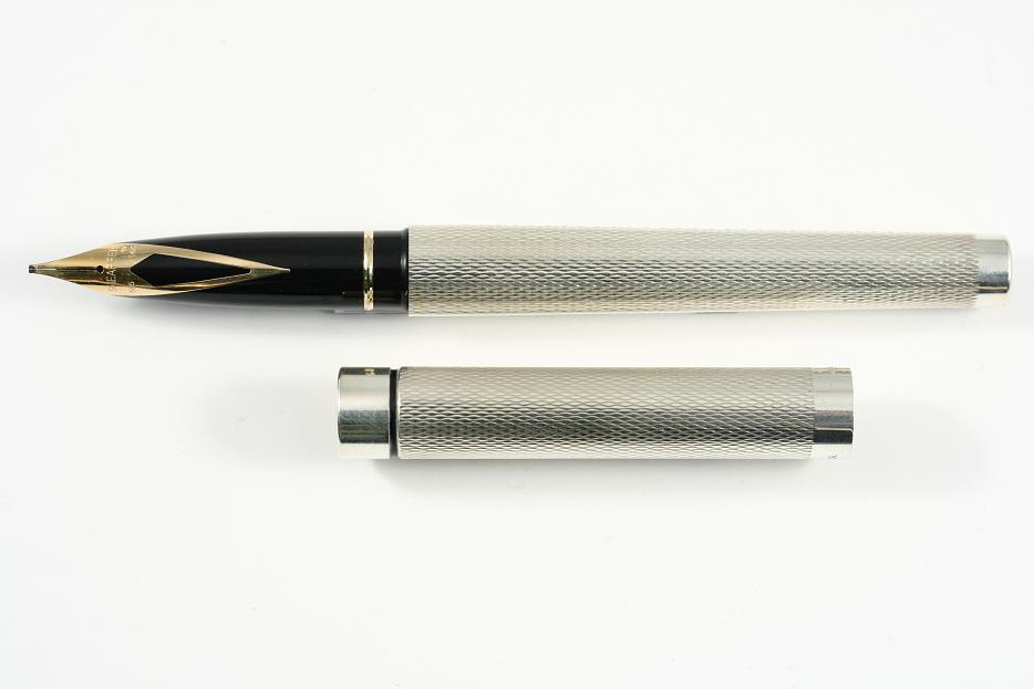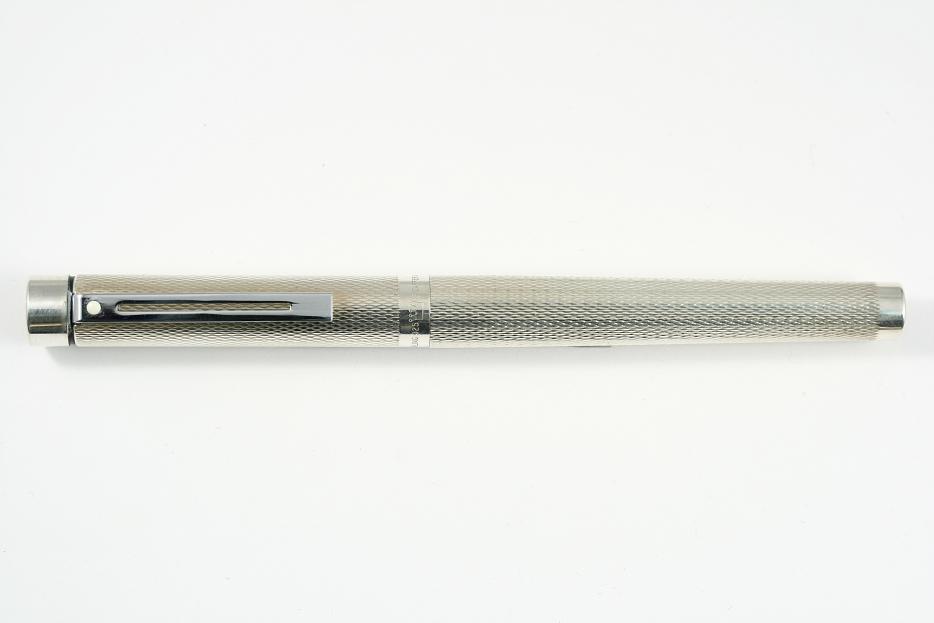 Sterling silver finish in a barleycorn pattern with a chrome plated clip and a 14-carat solid gold nib.